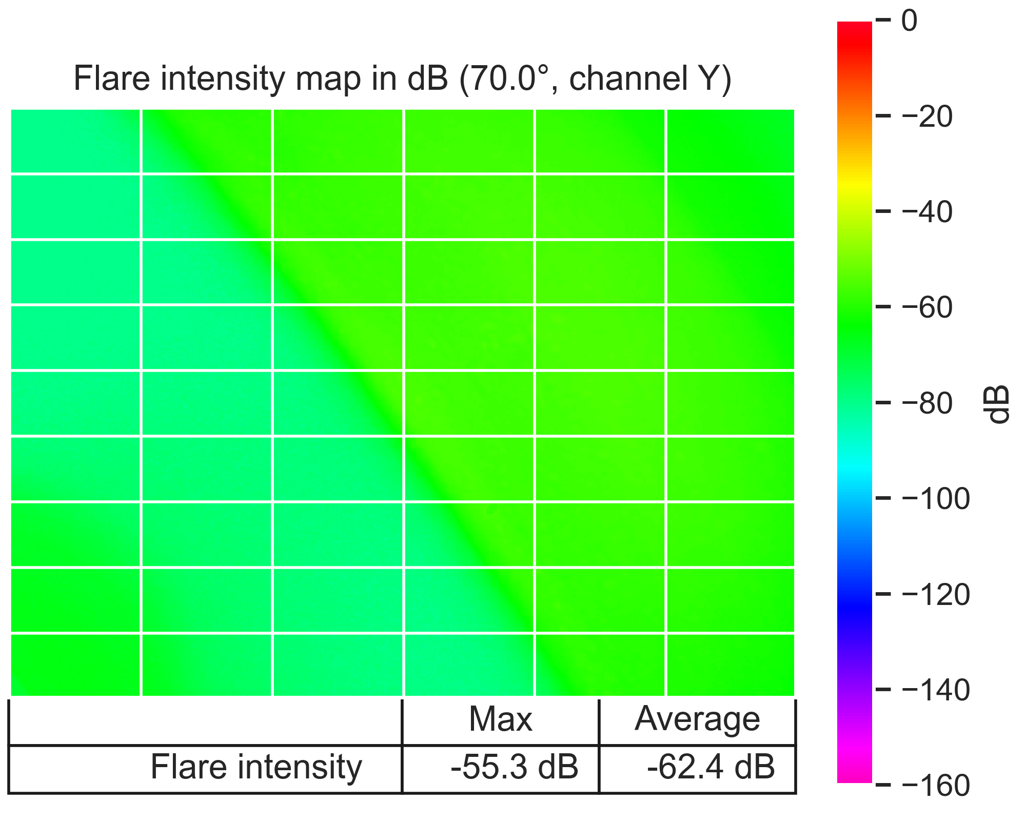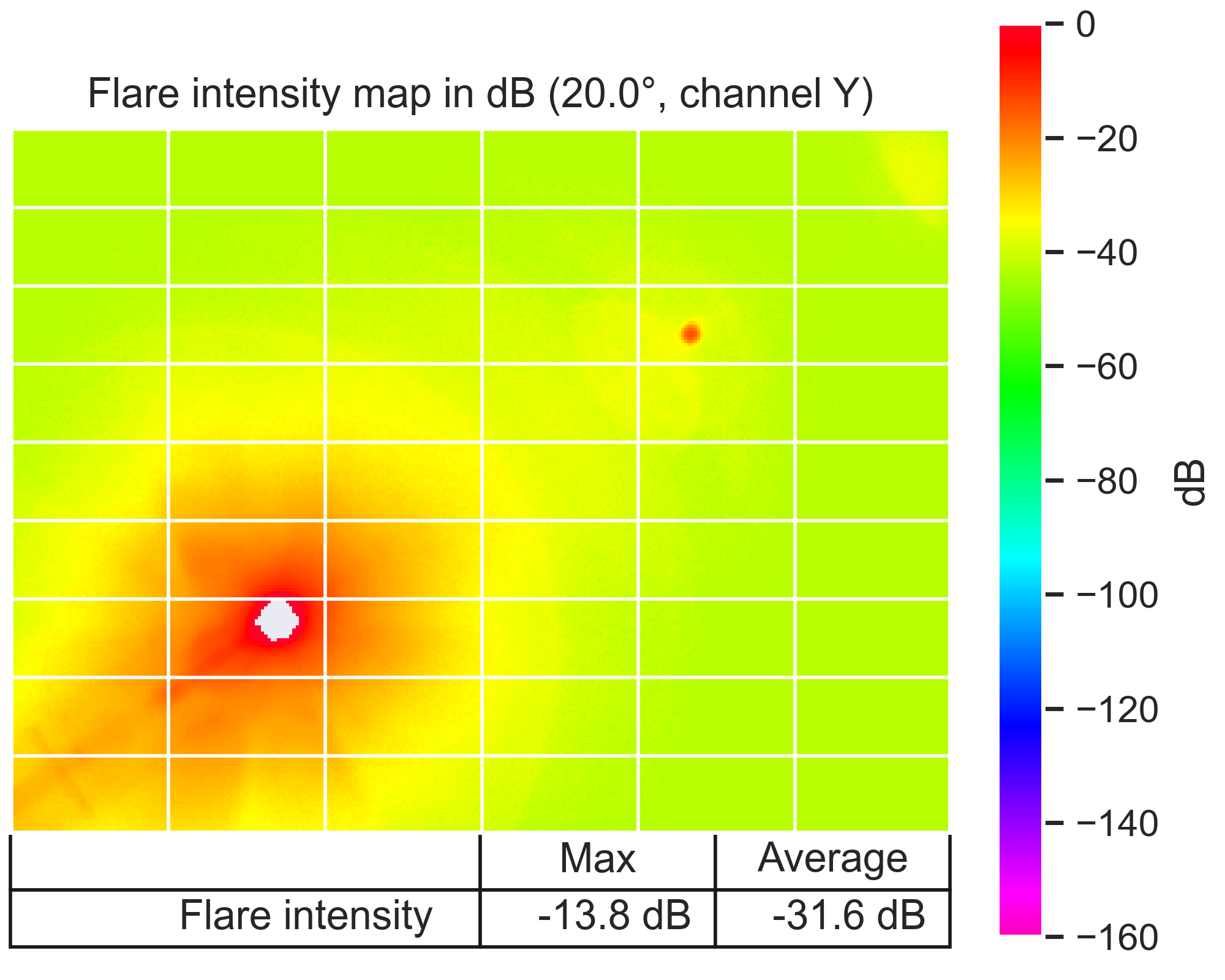 Both metrics are expressed in decibels (dB) and are numerically related. From the resulting flare maps, DXOMARK extracts two core key performance indicators: