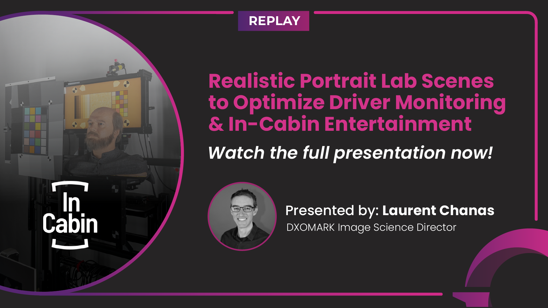 Presented by Laurent Chanas, this session explains how realistic portrait lab scenes help simulate true in-cabin lighting and why they are essential for evaluating both driver monitoring systems and in-cabin entertainment cameras.